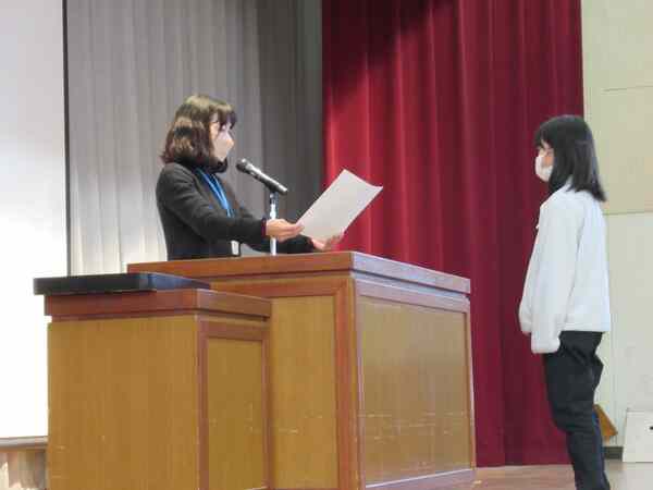 各種美術展関係や作文、人権に伴ったものなど、幅広い内容がありました。特に、多くの児童が表彰されるものから行い、代表児童が壇上で賞状を受け取りました。