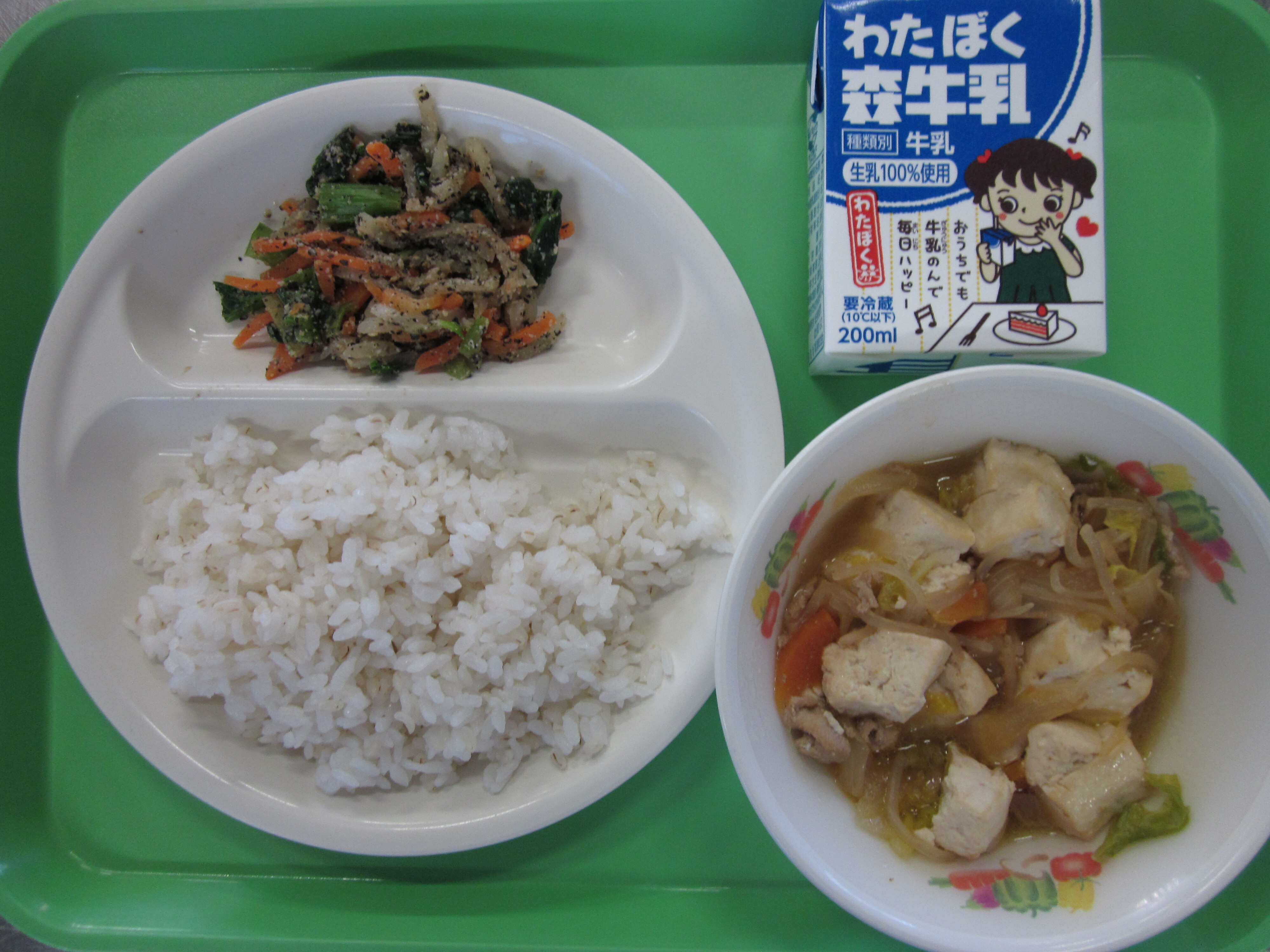 ☆今日の肉豆腐は、うまみをたくさん吸った豆腐やお肉が、ごはんとの相性抜群でした。「ごままみれ」は白ごまと黒ごまを使った「ごま」たっぷりの和え物です。これまた美味でした。残すところ2学期の給食も明日で最後。寒い中、給食を作っていただいている調理員さんに感謝して今日もおいしくいただきました。