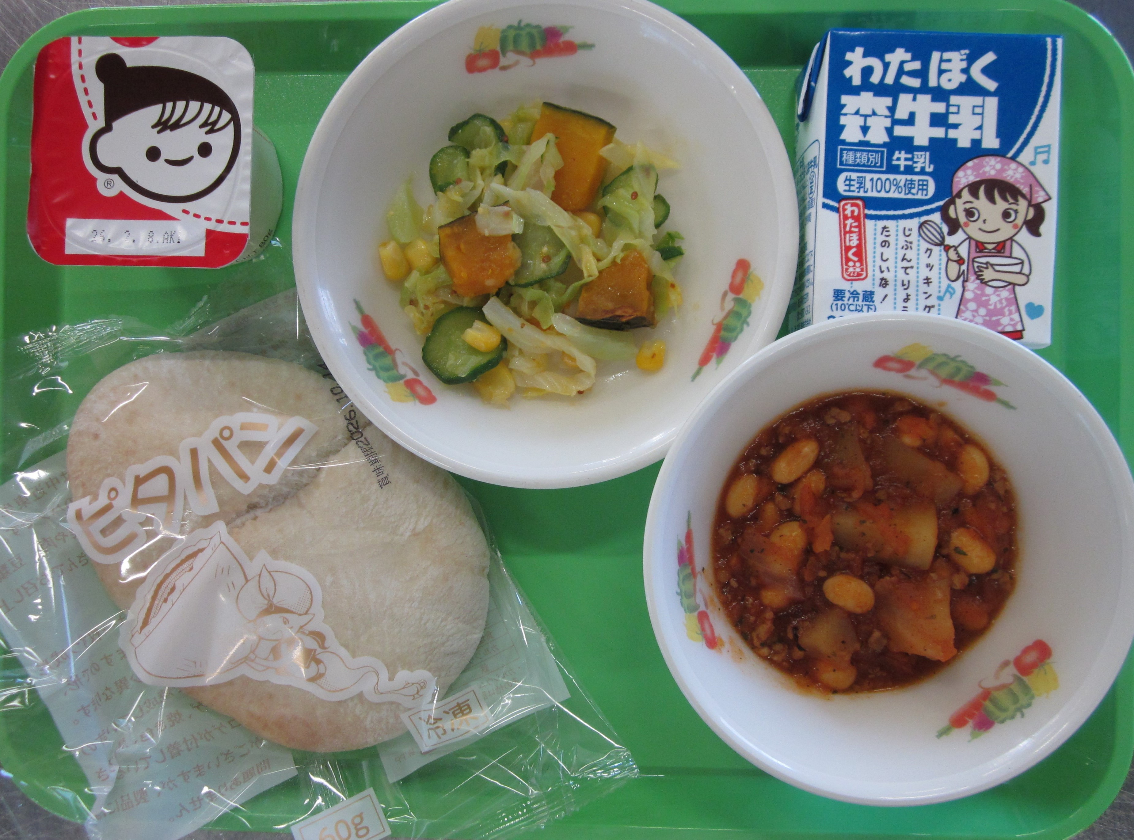 ☆今日は、メキシコ料理dayでした。メキシコの代表的な料理であるチリコンカンが出ました。スパイシーな風味とトマトの酸味が絡み合いピタパンとの相性抜群でした。メキシコ産のかぼちゃを使ったサラダもおいしかったです。