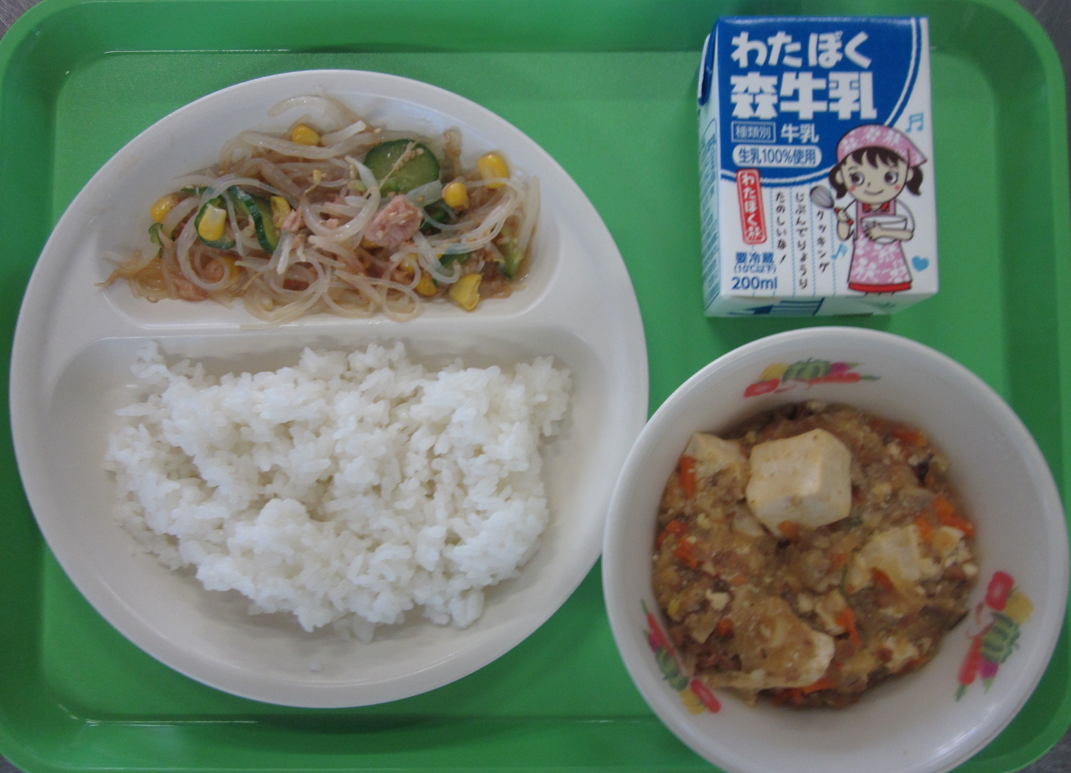 ☆今日の給食はさいたま市の海外姉妹友好都市、中国の料理です。さっぱりとした味付けの春雨サラダはコーンとツナがいいアクセントになっていていくらでも食べられるおいしさでした。麻婆豆腐→ごはん→麻婆豆腐→ごはん…、安定のおいしさです。