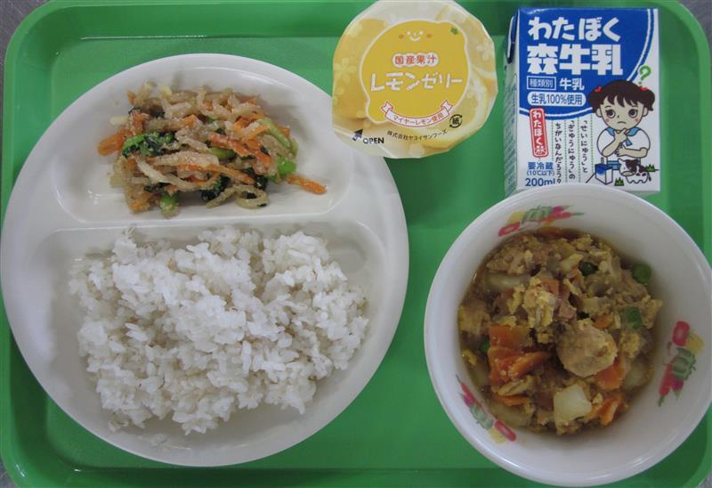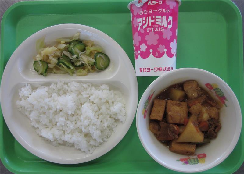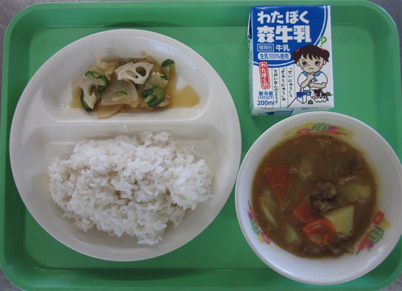 ★今日はポークカレーと福神漬けです。給食室で手作りの福神漬けは生姜がきいた甘めのたれに漬け込んで作っています。私の知っている福神漬けは赤い小さいものですが、手作り福神漬けは大根のほかにきゅうりと蓮根が入っていてとってもおいしいです。カレーとの相性も抜群です!