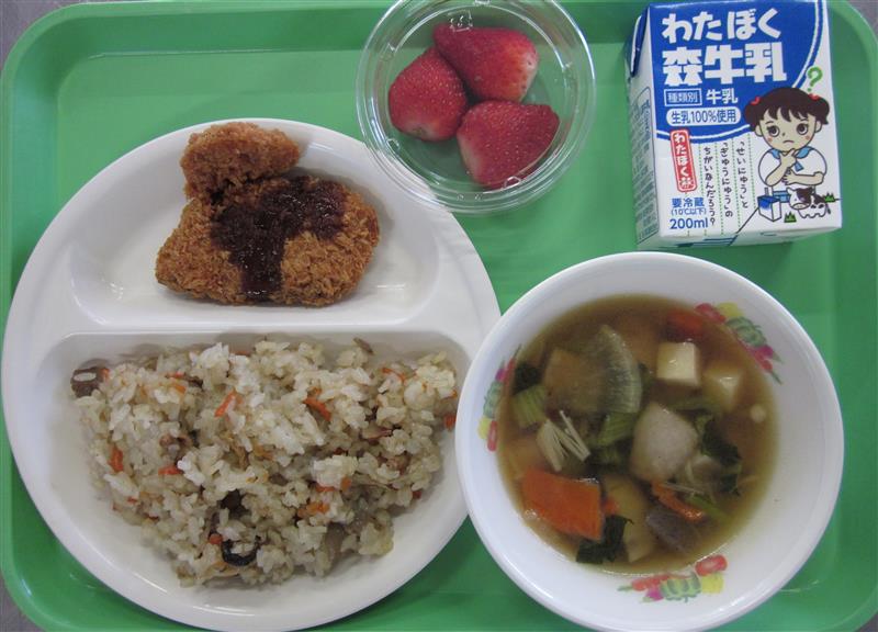 ★今日は6年生の児童が考えた献立「冬の旬な食材を使った給食」です。2月と3月に旬の食材を使って、栄養バランスも考えた献立です。炊き込みご飯とけんちん汁って、落ち着く味ですよね。かつおフライもサクサクでおいしかったです。