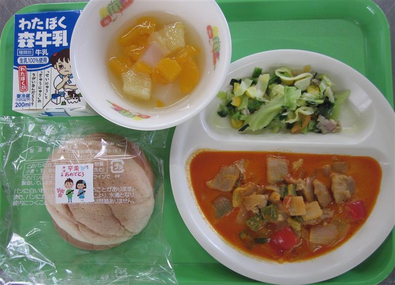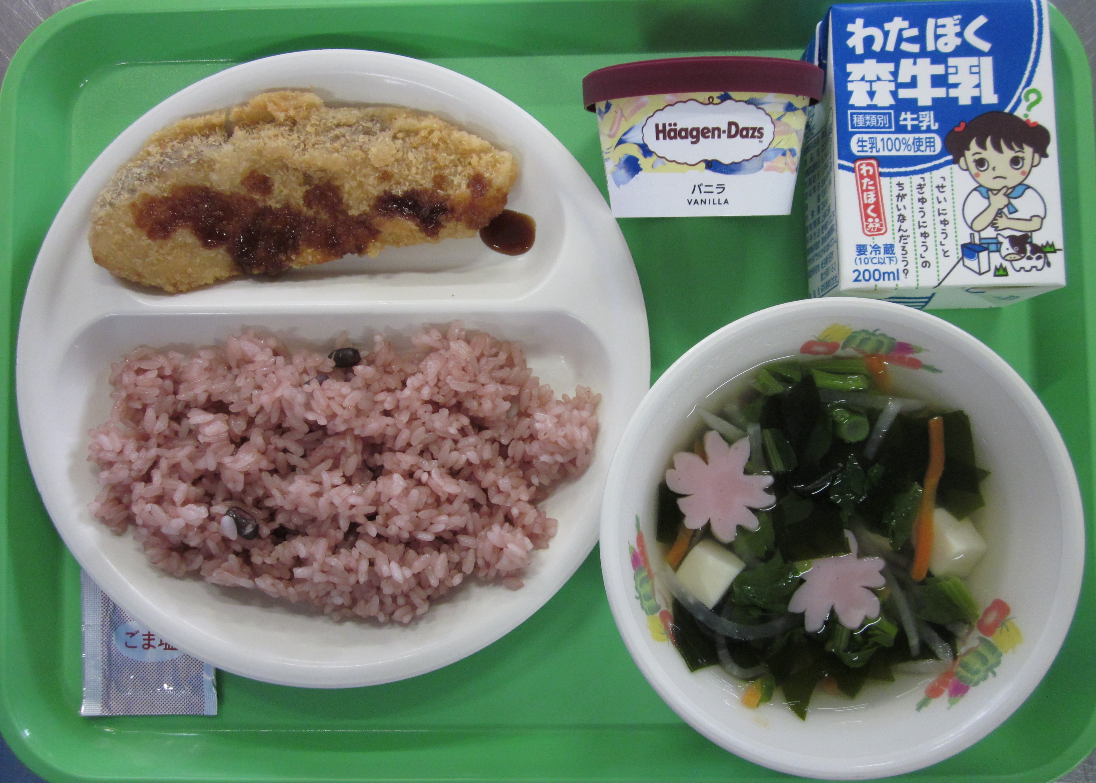 ★今日は赤飯・真鯛のフライ・すまし汁・アイスクリームで卒業・進級お祝い給食です。すまし汁には桜色の蒲鉾を使いました。今年度、最後の給食です。1年間、工夫した献立を考えてくれた栄養教諭の先生と作ってくれた調理員さんに感謝です。本当にありがとうございました!おいしかったです!