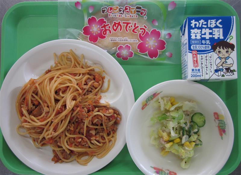 ★今日は人気のスパゲッティに卒業・進級祝いに「お祝いクレープ」です。朝から楽しみにしている子どもたちがいました。