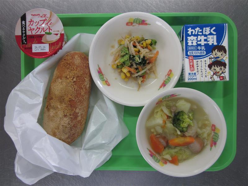 ★6年生の児童が家庭科の授業で考えた献立、「栄養たっぷり給食」です。サラダは、ごまの風味が食欲をそそりたくさん食べられてしまうおいしさです。ポトフも野菜にウインナーが入っていて旨味爆発です。きなこパンは安定のおいしさでした。