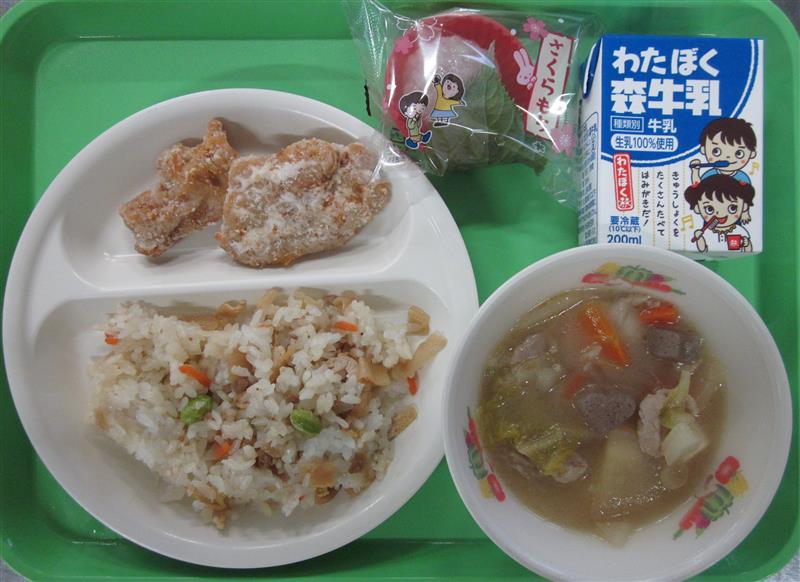 ★今日の給食はひな祭り給食で、6年2組の児童が考えた「彩りや栄養バランスも最高なあきない春の献立」です。豚汁に入っているこんにゃくはハート型です。サクサクな唐揚げと油揚げが入ったちらし寿司にさくらもちと豪華な給食でした!